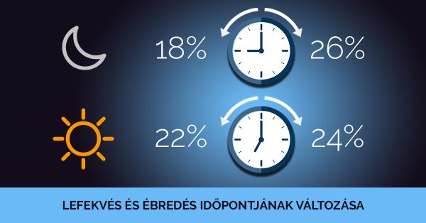 Elsőként a lefekvés és az ébredés időpontjára kérdeztek rá. A válaszadók 26%-a a COVID járvány előtti időszakhoz képest később, míg 18%-uk korábban feküdt le aludni, de a felkeléssel kapcsolatos szokások is jelentősen megváltoztak: a felmérésben részt vevők 22%-a korábban, míg 24%-uk később kelt fel a pandémia ideje alatt.