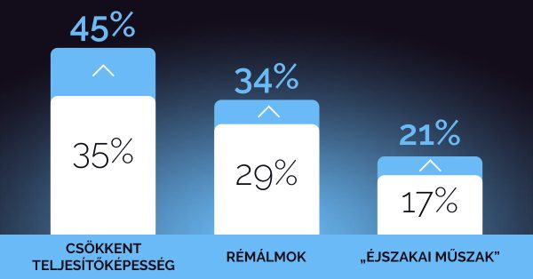 A járvány ideje alatt 35-ről 45%-ra növekedett azok száma, akik csökkent fizikai vagy szellemi teljesítőképességről számoltak be; 29-ről 34%-ra nőtt a rémálmokkal küszködők száma, és az „éjszakai műszak” aránya is romlott: 17-ről 21%-ra nőtt a munkahelyi vagy családi okokból éjszakázni kényszerülők száma.
